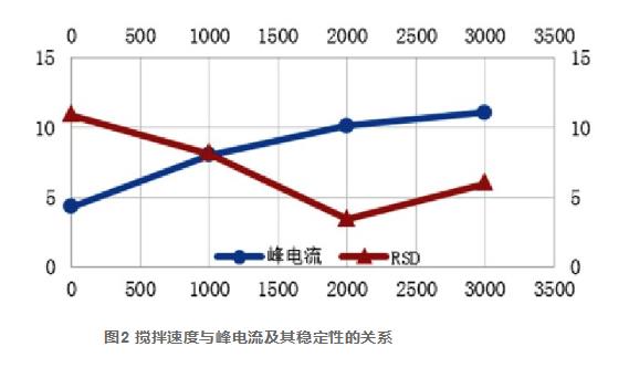 依據電化學原理,極限蔓延電流量與拌和轉速比相關。試驗挑選了0rpm、1000rpm、2000rpm、3000rpm,根據對Cd成分各自為4.0μg·L-1的水溶液開展平行面6次掃描儀,明確最好拌和速率。試驗效果如圖2所顯示。