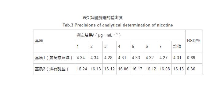 選擇一款香薄荷口感、沒(méi)有尼古丁的秘方煙液,各自加上約5 μg/mL的尼古丁水溶液(栽培基質(zhì)1)和尼古丁濃度值約為15 μg/mL的酒石酸尼古丁溶液(栽培基質(zhì)2),平行測(cè)定7次,各自測(cè)算栽培基質(zhì)1中的化合態(tài)尼古丁和栽培基質(zhì)2中的質(zhì)子態(tài)尼古丁的相對(duì)性相對(duì)標(biāo)準(zhǔn)偏差,結(jié)果見(jiàn)表3。在尼古丁和尼古丁鹽形狀下測(cè)量效果的RSD均低于1.0%,說(shuō)明方法的穩(wěn)定優(yōu)良。