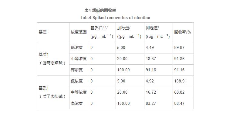選擇一款香薄荷口感、沒(méi)有尼古丁的秘方煙液,各自加上5、20、100 μg/mL化合態(tài)尼古丁水溶液,及其尼古丁量為5、20、100 μg/mL的酒石酸尼古丁溶液,測(cè)量化合態(tài)和質(zhì)子態(tài)尼古丁質(zhì)量濃度,測(cè)算尼古丁利用率,結(jié)果見(jiàn)表4。不一樣加標(biāo)濃度值下測(cè)量化合態(tài)和質(zhì)子態(tài)尼古丁的利用率均在85%~110%中間。