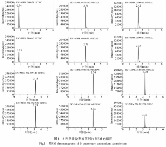 季銨鹽易喪失鹵素?zé)襞菡x子獲得共價鍵,故挑選EST 方式開展掃描儀。將配置好的各季銨鹽抗菌劑標(biāo)液根據(jù)針泵引進的方法引入離子源開展離子化,首先用Ql全掃捕明確標(biāo)準(zhǔn)物質(zhì)中總體目標(biāo)物的[M-X] 的母正離子峰,調(diào)節(jié)流動速度、通道工作電壓(entrancevo1tage,EV)、水解工作電壓等主要參數(shù)使母正離子峰做到最高值,再用子離子逐行掃描,更改撞擊工作電壓(co11isionvo1tage,CE)值,挑選倆對數(shù)據(jù)信號最強、最平穩(wěn)的子離子做為判定定量分析正離子,提升其撞擊動能,使離子對的接收靈敏度做到最高值,明確好之上主要參數(shù)后,選用多反映檢測方式(multiplereactionmonitoring,MRM)開展檢驗,各子離子的停留時問為100ms。最后在提升的色譜儀、質(zhì)譜分析標(biāo)準(zhǔn)下,獲得如圖所示1所顯示的各國家標(biāo)準(zhǔn)物質(zhì)濃度值為10μg/L時的多反映檢測色譜。TAC出峰快,保存期0.74min,BDAB保存期2.71min,DTAC保存期2.42min,TDBAC保存期3.19min,BDHAC保存時問3.74min,DDAC保存時問3.30min,六種季銨鹽類抗菌劑在提升的標(biāo)準(zhǔn)下分離出來效果非常的好,峰形對稱性。