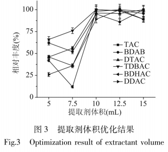 根據(jù)對6種季銨鹽類抗菌劑的正負(fù)極調(diào)查,實驗了水、乙腈、甲醇和乙醇4種極性溶劑對目的物的獲取實際效果。結(jié)果如圖2所顯示,在其中水和乙酸乙酯的獲取實際效果比較不佳,乙腈的獲取工作能力好于水和酒精,工業(yè)甲醇對6種季銨鹽抗菌劑的獲取實際效果最好,可能是工業(yè)甲醇本身優(yōu)良的透水性和適宜的正負(fù)極促使其對目的物獲取工作能力較強。