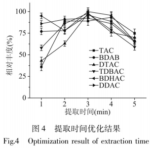 獲取時問就是指獲取劑和試品觸碰后從超聲波逐漸到完成的時間,獲取時問過短,獲取小夠充足;獲取時問太長會帶到太多影響化學(xué)物質(zhì)與此同時工業(yè)甲醇很有可能蒸發(fā)較多,減少獲取高效率,消耗的時長和動能太多。本科學(xué)研究調(diào)查了獲取時問為1、2、3、4和5min時的獲取實際效果,結(jié)果如圖4所顯示。,試驗發(fā)覺當(dāng)獲取時問為3min時作用最好??偟膩碚f,選擇3min為最好獲取時間。