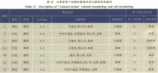 從現(xiàn)切香菜中分離出來(lái)出7種不一樣的菌種,各自編碼為1、2、3、C11、Y4、C1、12。分離出來(lái)得到的7種菌種的菌體形狀敘述、菌體形狀見表13和圖10。依據(jù)分離出來(lái)得到的7種菌種的菌體形狀敘述表及菌體形狀圖得知:菌種所有為革蘭氏陽(yáng)性菌陰性菌。關(guān)鍵為乳白色或是淡黃色。均正圓形。7株菌表層特點(diǎn)顯著,除Y4菌種外,其他菌體核心不透,且外表光潔潮濕。根據(jù)鏡檢查發(fā)覺,Y4菌種菌體特點(diǎn)為球形,別的菌種菌體呈桿狀或短桿狀。