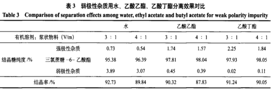 (2)在乙酸丁酯和溶液的機(jī)制中,三氯蔗糖-6-乙酸酯在乙酸丁酯中的擴(kuò)散系數(shù)比較大,乙酸丁酯的提純高效率,但其對(duì)強(qiáng)正負(fù)極殘?jiān)那宄咝瘦^低,不適感用以除去強(qiáng)正負(fù)極殘?jiān)?。而甲基叔丁基醚提純高效率貼近乙酸丁酯,對(duì)強(qiáng)正負(fù)極殘?jiān)ハ啾扔谝宜岫□?qiáng),去雜實(shí)際效果不錯(cuò),故挑選甲基叔丁基醚除去強(qiáng)正負(fù)極殘?jiān)?/p>