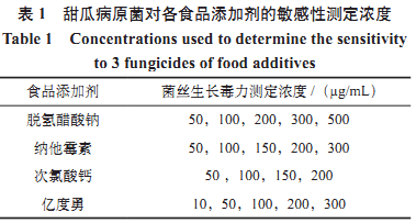 選用真菌生長發(fā)育速度法,將3種食用添加劑用無菌水融解后增加至熔融后制冷至約55℃的PDA培養(yǎng)液中,充足混勻,倒進(jìn)無菌檢測細(xì)胞培養(yǎng)皿中做成含藥平板電腦(每皿約15mL),終濃度值如下所示表。測量脫氫乙酸鈉、納他霉素、次氯酸鈣對供試病源細(xì)菌的抑制效果。