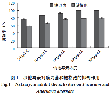 1、那他菌素對哈密瓜采后病蟲害病原菌的控制實(shí)際效果由圖1得知,那他菌素對哈密瓜采后病源細(xì)菌鐮刀菌、鏈格孢的生長發(fā)育抑制效果都比較顯著,伴隨著含量的提升其功能實(shí)際效果提高。濃度值為50µg/mL時,對鐮刀菌的抑制率為77.27%,對鏈格孢的抑制率為58.18%;200µg/mL時對鐮刀菌的抑制率做到100%,可是對鏈格孢的抑制率能做到78.18%。由此可見,那他菌素對鐮刀菌和鏈格孢都是有不錯的抑制效果,且對鐮刀菌的控制實(shí)際效果核對鏈格孢的明顯。