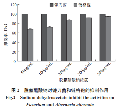 由圖2得知,脫氫乙酸鈉對鐮刀菌的抑制效果較強(qiáng),濃度值為50µg/mL時就可以充分抑止真菌的生長發(fā)育;對鏈格孢的抑制效果稍弱,抑制率做到67.82%,500µg/mL時可以抑止鏈格孢真菌的生長率為94.55%,從而表明,脫氫乙酸鈉對鐮刀菌和鏈格孢真菌的發(fā)育都是有不錯的抑制效果。