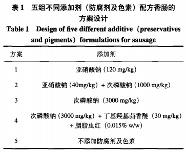 文中制定了次磷酸鈉成分差異的3組添加物秘方,與亞硝酸鈉組和空缺組較為,各自從色調(diào)、抑止內(nèi)毒素、質(zhì)構(gòu)指標(biāo)值、抗氧化性、微生物菌種等標(biāo)準(zhǔn)的比照,以科學(xué)研究次磷酸鈉能夠 取代亞硝酸鈉的水平,計劃方案如下所示。