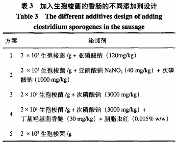 因肉毒梭菌毒副作用比較大,不宜試驗(yàn)室科學(xué)研究,因而,以肉毒梭菌的科學(xué)研究取代菌生孢梭菌來進(jìn)行科學(xué)研究。為了更好地科學(xué)研究亞硝酸鈉和次磷酸鈉對(duì)臘腸中添加的生孢梭菌的調(diào)節(jié)狀況,特制定了五組臘腸中一起添加生孢梭菌和添加劑(亞硝酸鈉和次磷酸鈉),在25℃下儲(chǔ)放,檢驗(yàn)臘腸中生孢梭菌生長發(fā)育情況,方案設(shè)計(jì)見表3,此表只適用硝酸鈉和次磷酸鈉抑止內(nèi)毒素剖析。
