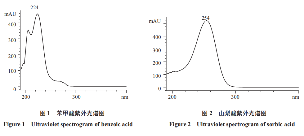 用二極管列陣探測器對規(guī)范混和水溶液在150 ~ 400nm 范疇內(nèi)開展光波長掃描儀,發(fā)覺苯甲醛在 224nm、山梨酸在 254nm、糖精鈉在207nm、安賽蜜在 227nm、脫氫乙酸在 230nm 上有較大消化吸收,如圖所示 1 ~ 5 所顯示。依據(jù)試品特點及前處理中化學(xué)試劑的影響狀況,挑選檢驗光波長為 230nm,在這里光波長標準下,五種添加物可另外開展檢驗并獲取最高敏感度。