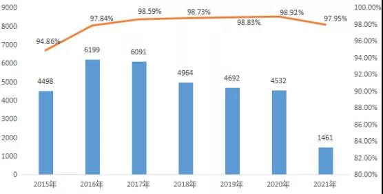 2015年1月1日至2021年9月15日我國(guó)及地區(qū)銷售市場(chǎng)監(jiān)管單位(省、自治州、市轄區(qū))共抽樣檢驗(yàn)月餅商品32437批號(hào),在其中達(dá)標(biāo)31789批號(hào),不過(guò)關(guān)648批號(hào),達(dá)標(biāo)率為98.00%。
