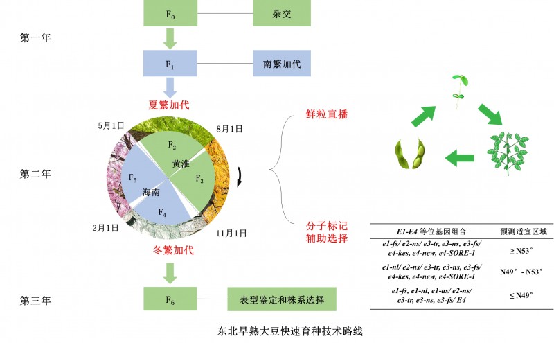 科學(xué)研究員工在對(duì)黃豆光溫反映特點(diǎn)和在我國(guó)全國(guó)各地土壤條件開展長(zhǎng)期性深入探究的根基上,運(yùn)用在我國(guó)黃淮海和華南區(qū)夏天相對(duì)性較短的日照和高溫標(biāo)準(zhǔn),各自完成北方地區(qū)春黃豆和黃淮海夏大豆的外地夏繁2代,融合冬天南繁、鮮粒直播間和分子標(biāo)記輔助挑選(MAS)技術(shù)性,取得成功搭建了徹底依靠太陽(yáng)光溫標(biāo)準(zhǔn)的成本低、效率高黃豆迅速繁育技術(shù)性管理體系。該工藝具體涉及下述階段:(1)在春、夏、秋天,將北方地區(qū)春黃豆和黃淮海夏大豆繁育原材料,各自栽種在比其出產(chǎn)地日照更短、溫度更好的黃淮海和華南區(qū),使其在自然條件下進(jìn)行外地繁育2代(通稱夏繁);(2)采收主莖下端處在鼓粒中后期的莢果,對(duì)新鮮種籽開展簡(jiǎn)易加工處理后栽種,進(jìn)一步減少繁育周期時(shí)間;(3)冬天在海南繁育2代(冬繁);(4)對(duì)高代原材料(如F5)開展 E1 – E4 等生長(zhǎng)期有關(guān)基因組的檢驗(yàn),依據(jù)單倍型組成預(yù)測(cè)分析其生長(zhǎng)期組和適合栽種地區(qū)。以上迅速繁育系統(tǒng)軟件,可在自然條件下完成一年繁育4代,完成規(guī)模性、成本低的黃豆迅速繁育。該辦法對(duì)別的短日照農(nóng)作物繁育高效率的增強(qiáng)也具備參考使用價(jià)值。