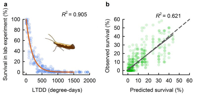 為了更好地精確預測分析氣候問題下小菜蛾的過冬范疇,科學研究團體根據(jù)房間內(nèi)仿真模擬和田里認證,分析出牽制小菜蛾過冬的重要氣候因子,即超低溫積溫日度(冬天日均溫11°C下列的積溫),并搭建出超低溫日度實體模型。馬春森詳細介紹,“大自然繁雜天氣條件下,超低溫日度實體模型能表述62.1%的成活率,這遠遠地高于之前的超低溫生存實體模型。那么高的精確度,主要是該實體模型精確地模仿了決策小菜蛾超低溫身亡的全過程,即長期性超低溫損害,而不是在非常低氣溫下受凍。此外,超低溫積溫日度這一氣候因子非常容易從以前的氣侯數(shù)據(jù)信息和以后的場景中得到。”在我國河南是小菜蛾過冬的“邊沿”地區(qū)。過去50年里,氣候問題使全世界小菜蛾的過冬遍布總面積增加了2四十萬平方千米;將來平均溫度每升高1℃,將造成 過冬遍布擴張約2二十萬平方千米。
