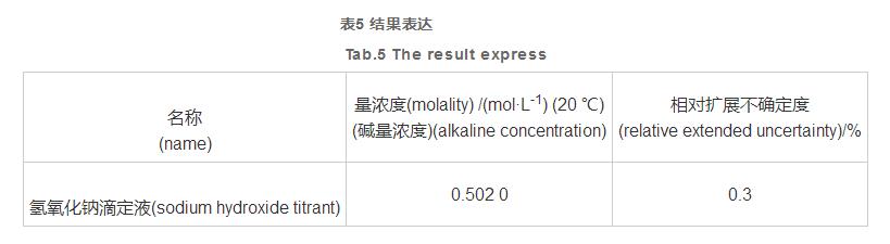 該氫氧化鈉溶液滴定管液以容積校準(zhǔn)法律規(guī)定值, 勻稱性優(yōu)良,以0.502 0 mol·L-1為指標(biāo)值, 有效期限超過 6 個(gè)月,相對(duì)性拓展測量不確定度為 0.3%(k=2)(表5)。