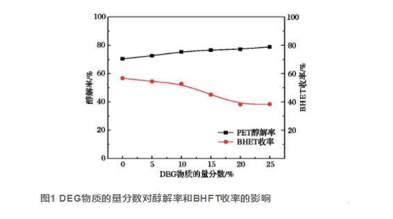 從圖1由此可見(jiàn):伴隨著DEG摩爾質(zhì)量成績(jī)從0提升至25%,醇解率由70%擴(kuò)大至80%,表明在相同條件下擴(kuò)大DEG成分能加速醇解速度;BHET產(chǎn)出率則從55%降到40%。這是由于伴隨著DEG與PET反映的開(kāi)展,除開(kāi)轉(zhuǎn)化成BHET外,還產(chǎn)生了: