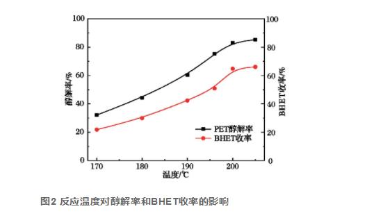 自然壓下EG的熔點(diǎn)為196℃,本實(shí)驗(yàn)中因?yàn)榧尤肓薉EG能提升 醇解劑的熔點(diǎn),使反映溫度在自然壓下會(huì)做到205℃上下,因此在170~205℃范疇對(duì)PET醇解反映開(kāi)展實(shí)驗(yàn)。由圖2得知,伴隨著氣溫的上升,PET醇解率從32%擴(kuò)大至85%,BHET成品率從22%擴(kuò)大至66%。這主要是因?yàn)檩^高的氣溫能夠 加速分子熱運(yùn)動(dòng),使醇解速度變快。在反映溫度做到200℃后,醇解率和BHET成品率保持穩(wěn)定,各自做到83%和65%。