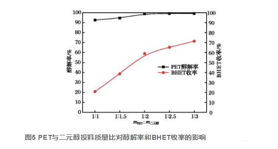由圖5得知,在選定的PET與二元醇質量比范疇內(nèi),PET的醇解率都到達了90%之上,當mPET∶m二元醇為1∶2時,PET的醇聚率貼近100%,BHET成品率為60%;再次增加二元醇加料比,BHET的成品率再次擴大,做到75%。這是由于伴隨著二元醇的占比擴大,與PET的了解更充足,醇解反應速率加速,反映水平更為完全,BHET產(chǎn)出率也隨著擴大,因此 mPET:m二元醇在1∶2~1∶3范疇較為適合。