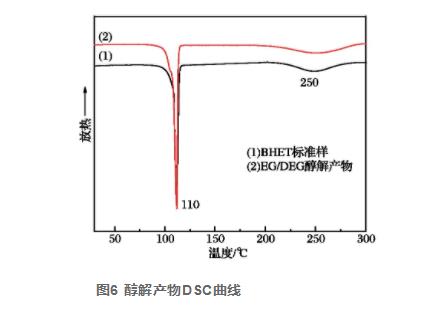 圖6為醇解物質的DSC曲線圖,在其中曲線圖(1)為選購的BHET規(guī)范試品,曲線圖(2)為EG/DEG與PET的醇解物質。由圖6由此可見,兩試品曲線圖均在110℃上有銳利的吸熱反應峰,在250℃上下有廣闊的吸熱反應峰。依據(jù)PINGALE的畢業(yè)論文報導,110℃處為BHET的熔化吸熱反應峰,而在250℃處則是提溫歷程中BHET產(chǎn)生加聚反應所造成的EG蒸發(fā)吸熱,進而建立了熔域開闊的吸熱反應峰。