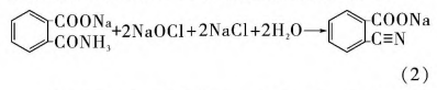 因為苯酐氨解時與此同時產生氨鹽,進而導致系統(tǒng)中分散的氨分子的濃度值快速減少,當氫氧化鈉溶液添加量少時,將無法完全將氨鹽中的氨分散出去,使胺化反映遇阻,進而成品率降低。在下一步酯化反應中,從霍夫曼降解反映原理看,反映中應維持一定的酸堿度,若偏堿不夠則有以下不良反應產生,見式(2):