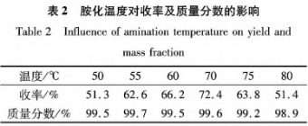 更改胺化反映隔熱保溫溫度,調查胺化溫度對乙酯的成品率與質量濃度的危害,結果見表2。