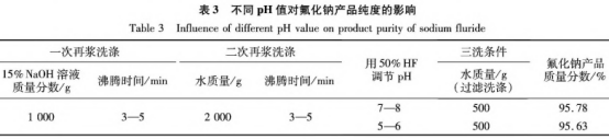 從表3和表4試驗結論得知,根據(jù)稀的氫氧化鈉溶液和水再漿清洗后,再調整料漿的pH值,再清洗、過慮、干躁就可以制取質量濃度為99%的氟化鈉商品。