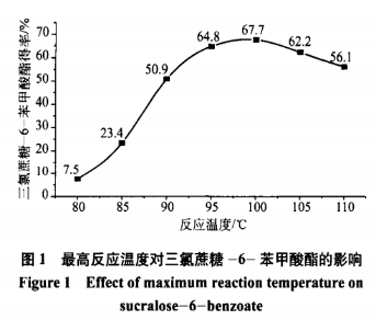 固定不動(dòng)加料比、反應(yīng)速度、助有機(jī)溶劑、猝滅標(biāo)準(zhǔn)一致的情形下,僅更改最大反映溫度,使原材料各自在80℃、85℃、90℃、95℃、100℃、105℃、110℃下反映,將得到的三氯蔗糖-6-苯甲醛酯開展檢驗(yàn),得率如圖所示1所顯示。