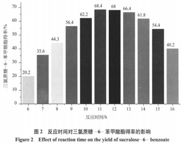 固定不動(dòng)加料比、反映溫度、助有機(jī)溶劑、猝滅標(biāo)準(zhǔn)一致的情形下,讓原材料在100℃上各自反映6h~16h。將得到的三氯蔗糖-6-苯甲醛酯開展檢驗(yàn),得率如圖2所顯示。