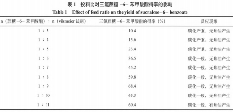在氯代反映歷程中,應(yīng)用氯化亞砜為氯代劑時(shí),氯代高效率較低,因而在反映前生成vilsmeier實(shí)驗(yàn)試劑做為氯代實(shí)驗(yàn)試劑。vilsmeier實(shí)驗(yàn)試劑在一定情況下對(duì)氯代綿白糖-6-苯甲醛酯上的6’、4、1’甲基具備高可選擇性。在反映溫度、反應(yīng)速度、助有機(jī)溶劑、猝滅標(biāo)準(zhǔn)一樣的標(biāo)準(zhǔn)下,挑選 綿白糖-6-苯甲醛酯與vilsmeier實(shí)驗(yàn)試劑摩爾質(zhì)量的加料之比1∶3~1∶11。觀查加料核對(duì)氯代反映的危害。