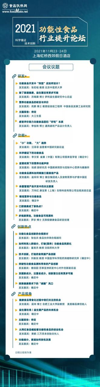 在這里情況下,由食用添加劑網(wǎng)承辦的“2021功能食品領(lǐng)域提高社區(qū)論壇”將于11月23-24日在上海虹橋站南郊假日酒店舉行。此次社區(qū)論壇將以“科學(xué)研究循證,技術(shù)革新”為主題風(fēng)格,一同討論功能食品領(lǐng)域最前沿科學(xué)研究,領(lǐng)域政策法規(guī),自主創(chuàng)新技術(shù)性,構(gòu)建一個(gè)領(lǐng)域內(nèi)隨意溝通交流、信息內(nèi)容共享、協(xié)作的服務(wù)平臺(tái),推動(dòng)功能食品領(lǐng)域的良好發(fā)展趨勢。