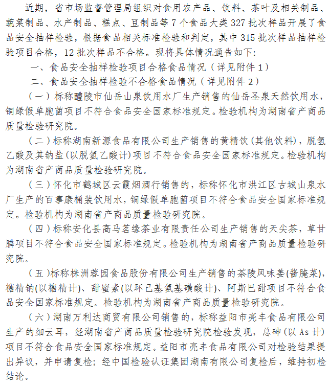 湖南銷售市場監(jiān)督管理局有關(guān)327批號(hào)食品衛(wèi)生安全抽樣檢查狀況的通知(2021年第20期)