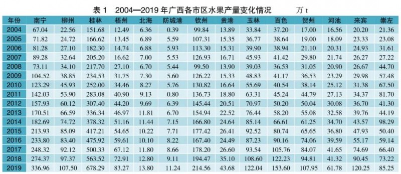 由2004—2019年廣西省各市縣新鮮水果生產(chǎn)量轉(zhuǎn)變狀況(表1)得知,廣西水果栽種生產(chǎn)制造遍布比較集中化,關(guān)鍵遍布在桂林市、南寧市、欽州市,2019年3個(gè)市新鮮水果生產(chǎn)量各自為678.29萬(wàn)、336.96萬(wàn)、214.56萬(wàn)t,各自占我區(qū)新鮮水果總產(chǎn)值的31.69%、15.75%和10.03%,超出廣西水果總產(chǎn)值的一半。次之為百色市、欽州、賓客、廣西賀州、柳州市,5個(gè)市新鮮水果生產(chǎn)量之和占我區(qū)新鮮水果總產(chǎn)值的28.57%。蔬菜種植遍布較少的為北海市、廣西防城港市,2019年新鮮水果生產(chǎn)量各自為13.80萬(wàn)、11.24萬(wàn)t。
