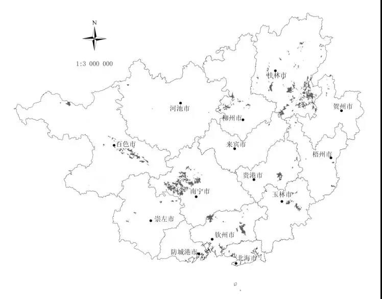 圖1 2017年廣西省各市縣種植園遍布狀況