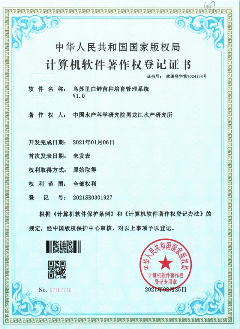 由黑龍江省所鮭鱒財產(chǎn)繁育自主創(chuàng)新精英團隊徐革鋒研究者等產(chǎn)品研發(fā)的“烏蘇里白鮭苗種培養(yǎng)智能管理系統(tǒng)V1.0”得到我國電子計算機軟件著作,資格證書為軟件著作權(quán)登字第7024154號,法人代碼為2021SR0301927。