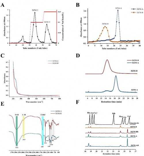 圖2 DZM在DEAE-52甲基纖維素正離子柱上的過柱曲線圖(A);Sephadex G-100過柱曲線圖(B);DZM-A和DZM-B的紫外光譜(C);DZM-A和DZM-B的HPGPC色譜儀(D);DZM-A和DZM-B的紅外光譜分析(E);糖醛酸復原前后左右的單糖構成(F)。