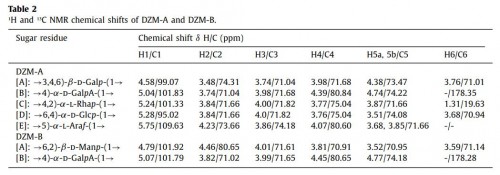 DZM-A和DZM-B的磁共振圖普如圖所示3所顯示。最先在HSQC譜圖的異頭區(qū)尋找特點數(shù)據(jù)信號,隨后依據(jù)相應的碳氫化合物數(shù)據(jù)信號,從異頭氫的數(shù)據(jù)信號考慮,逐漸將鄰近的氫氫有關數(shù)據(jù)信號在COSY圖普上尋找。再相反依據(jù)氫原子的數(shù)據(jù)信號,在HSQC圖上尋找相應的氧原子數(shù)據(jù)信號。實際的每個殘基的 C/H 化學位移如表2所顯示。