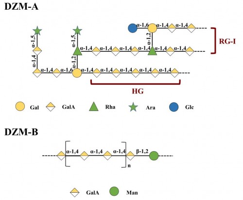 結果推斷出DZM-A是由均聚半乳糖醛酸聚糖(HG)為主導鏈和鼠李半乳糖醛酸聚糖結構域(RG-I)為碳鍵構成的繁雜阿拉伯膠含糖量;DZM-B主要是由HG構成的網(wǎng)盤直鏈阿拉伯膠含糖量。DZM-A和DZM-B很有可能的結構模型如圖4所顯示。