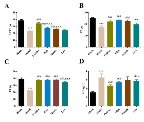 圖6結果表明,DZM-A可根據(jù)內源和外源凝血功能方式抑止凝血機制。在圖7中,DZM-A根據(jù)調整6-KETO-PGF1α和TXB2的成分,主要表現(xiàn)出突出的抗凝功效。