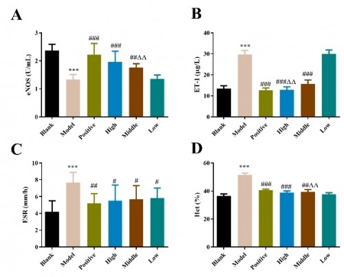 NO和ET-1是調整心腦血管病作用的主要因素,對保持內分泌系統(tǒng)穩(wěn)定與毛細血管支撐力起著至關重要的功效。在圖8中,DZM-A根據(jù)調整ET-1和eNOs成分主要表現(xiàn)出突出的抗凝功效,在其中高使用量組的DZM-A主要表現(xiàn)出與呈陽性組同樣的功效。圖9數(shù)據(jù)顯示,DZM-A可利用危害不一樣切變頻率情況下的全血粘度、血漿粘度,主要表現(xiàn)出突出的抗凝血功效。