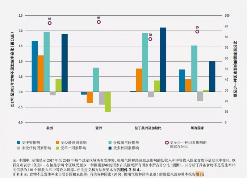 南美洲及加勒比是2017至2019年間受各種要素干擾造成 食材不夠發(fā)病率漲幅較大的地區(qū),而非州是唯一一個與此同時受三種要素干擾造成 食材不夠發(fā)病率升高的地區(qū)。聯(lián)合國糧農(nóng)組織