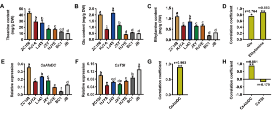 茶多酚關(guān)鍵在茶樹根中生成。本分析中,創(chuàng)作者經(jīng)過解析不一樣油茶樹種類根中茶多酚成分和其底物(磷酸和乙胺)成分的關(guān)聯(lián)性 (圖1A-D),發(fā)覺乙胺成分和茶多酚成分呈相對高度成正比, 說明乙胺對茶多酚的累積具有主導(dǎo)作用。并發(fā)覺生成乙胺的丙氨酸脫羧酶編號遺傳基因CsAlaDC的表述量和乙胺、茶多酚的成分也展現(xiàn)相對高度成正比(圖1E-H),說明CsAlaDC對油茶樹很多生成茶多酚尤為重要。值得一提的是,茶多酚合酶編號遺傳基因CsTSI的表示與茶多酚成分不立即有關(guān)。