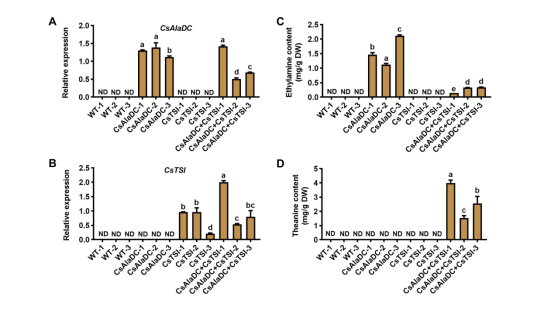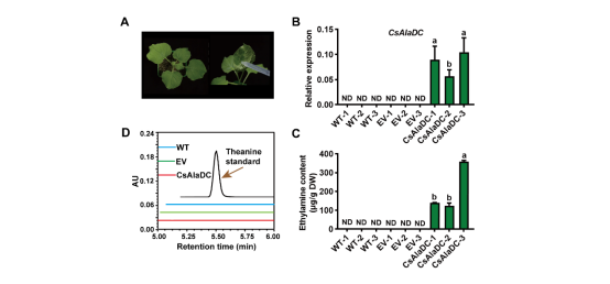 圖3 共表達CsAlaDC和CsTSI的香煙葉子中生成了很多茶多酚