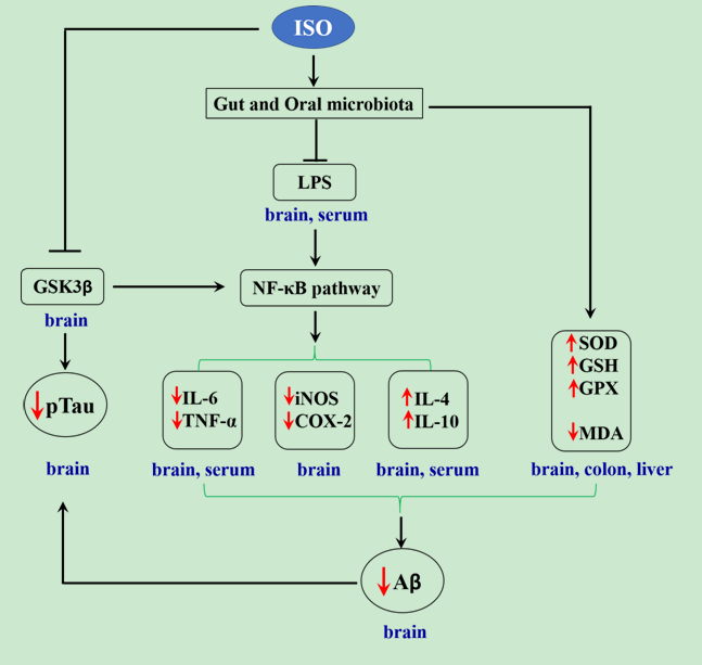 綜合性全部實(shí)驗(yàn)結(jié)果,基本推斷異葒草素緩解老年性癡呆病有關(guān)病理學(xué)指標(biāo)值的原理為:經(jīng)過調(diào)整口腔內(nèi)部和腸道微生物有益菌構(gòu)造,減少血清蛋白和腦部中LPS的成分,從而抑止LPS誘發(fā)的NF-κB發(fā)炎通道,最后根據(jù)腦-腸軸來調(diào)整并緩解老年性癡呆病有關(guān)病理學(xué)指標(biāo)值。
