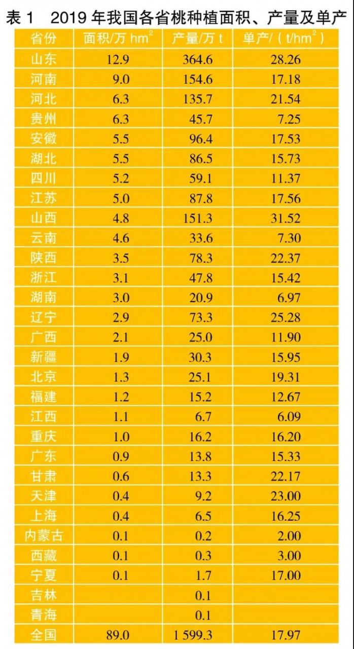 在我國有20個省的桃栽種總面積超出一萬hm2,穩(wěn)居前5位的省區(qū)先后為山東省、河南省、河北省、貴州省和安徽省,總產(chǎn)值穩(wěn)居前5位的省區(qū)先后為山東省、河南省、山西省、河北省、安徽?。欢a(chǎn)量水準穩(wěn)居前5位的省區(qū)先后為山西省、山東省、遼寧省、天津市、陜西?。ū?),展現(xiàn)出北方地區(qū)明顯高過南方地區(qū)的發(fā)展趨勢。