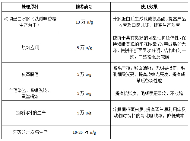 【皮革工業(yè)】參考用量:皮革脫毛150~300u/g皮重,皮革軟化8~15u/g皮重。利用中性蛋白酶可制成脫毛劑,經(jīng)鞣制的皮革,脫毛干凈,粒而清晰,無明顯損傷,毛孔細(xì)致光亮。