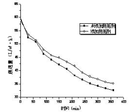 圖4 不一樣pH值下膜通量隨時(shí)間的衰減系數(shù)狀況 圖5 反滲透阻垢劑對(duì)膜通量的危害