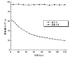 圖2 有機(jī)物納濾膜不一樣水質(zhì)采樣膜通量隨時(shí)間的衰減系數(shù)狀況 圖3 表層清洗對(duì)膜通量的危害