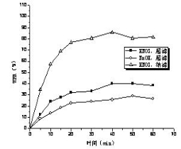 從圖2可以看得出,在同樣實(shí)際操作標(biāo)準(zhǔn)下,立即對(duì)滲濾液源液開(kāi)展納濾膜,膜通量降低迅速,而經(jīng)超濾膜預(yù)備處理以后的水質(zhì)采樣開(kāi)展納濾膜時(shí),膜通量隨時(shí)間的衰減系數(shù)比較遲緩。表明超濾膜預(yù)備處理針對(duì)緩解有機(jī)物納濾膜的膜環(huán)境污染具備一定的實(shí)際效果。