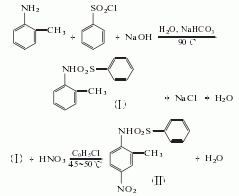 采用鄰甲苯胺與對甲磺酰氯為原料,經縮合、硝化、水解,中和及過濾干燥而得。原料消耗定額:鄰甲苯胺(工業(yè)品)945kg/t、燒堿(100%)1350kg/t、苯磺酰氯(工業(yè)品)1650kg/t、小蘇打(工業(yè)品)40kg/t、氯苯(工業(yè)品)460kg/t、硫酸(100%)3100kg/t、硝酸(98%)680kg/t、氨水(20%)6230kg/t、亞硝酸鈉10kg/t、亞硫酸鈉(工業(yè)品)26kg/t。