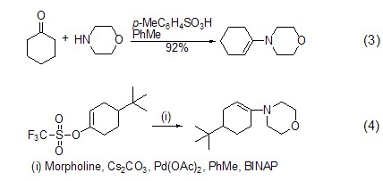 亞胺的形成 嗎啡啉是合成烯胺的三個主要二級胺中的一個,堿性比哌啶和四氫吡咯弱,因此烯胺的形成速度要比哌啶和四氫吡咯慢。嗎啡啉在形成烯胺的過程中,區(qū)域選擇性也比吡啶和四氫吡咯差[4]。飽和的醛、酮與嗎啡啉合成烯胺時,可以直接在苯中加熱反應[5],或用對甲苯磺酸、四氯化鈦催化 (式3)[6],也可用微波照射[7],或者與三氟磺酸烯醇酯在Pd催化作用下反應生成 (式4)[8]。