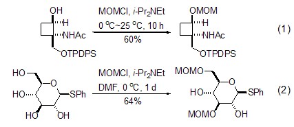 (氯甲基)甲基醚是醇的保護(hù)基中最重要的保護(hù)基之一,在有機(jī)合成中具有重要的地位。它的基本優(yōu)點(diǎn)是上保護(hù)容易,且產(chǎn)率較好;可在多條件下去保護(hù),具有廣泛的適用范圍[2]。與醇的反應(yīng)是(氯甲基)甲基醚應(yīng)用最為頻繁的功能,該反應(yīng)條件非常溫和。一般需要在一個堿的存在下進(jìn)行,最常用的堿是n-Pr2NEt (式1)[3~5]。在多個羥基存在的情況下,通過適當(dāng)?shù)剡x擇條件,可以達(dá)到高度的區(qū)域選擇性 (式2)[4,5]。